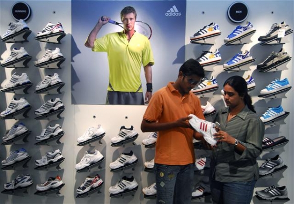 ▲독일 스포츠 용품업체 아디다스가 인도에서 1달러 신발을 출시할 계획이다. 사진은 인도 뭄바이의 아디다스 매장.블룸버그.