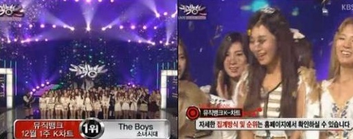 소녀시대는 2일 KBS 2TV 가요 프로그램 뮤직뱅크에서국내 정규 3집 타이틀곡 ‘더 보이즈’로 1위를 차지했다.