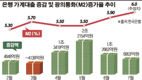 이는 2011년 1월 6.5% 증가율 이후 가장 높은 것이다. 특히 M2의 증가율은 지난 2월부터 5개월 연달아 5%를 넘어서 시중 자금의 유동성 증가를 나타냈다. 7월 M2의 증가율 또한 6%대를 기록할 것이라는 전망이다.