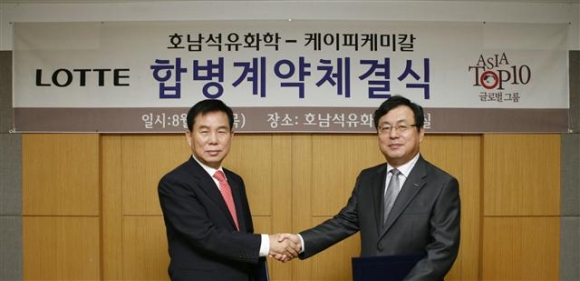 ▲호남석유화학 허수영 대표이사(왼쪽)과 케이피케미칼 김창규 대표이사가16일 호남석유화학 본사 10층에서 합병 계약을 체결했다.