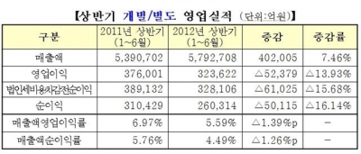 2분기(2012년 4~6월) 실적도 역시 하락했다. 매출액은 전기 대비 1.17% 감소, 영업이익 및 순이익은 각각 26.28%, 29.76% 내려갔다.