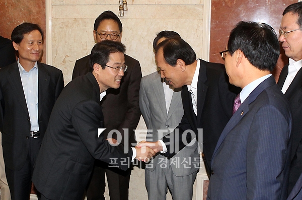 권혁세 금융감독원장이 31일 오전 여의도 렉싱턴 호텔에서 열린 카드사 CEO와의 간담회에 참석하며 카드사 대표들과 인사를 나누고 있다
