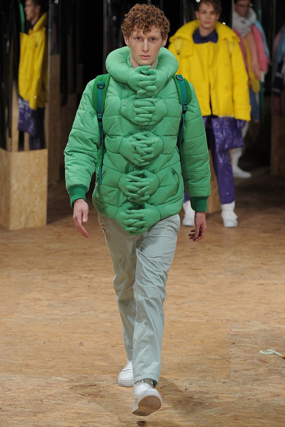 사진 속 패딩은 한 컬렉션에서 공개된 옷으로 예쁜 초록 색상이 특징이다. 하지만 패딩의 디자인이 일반적인 패딩과는 다르다. 패딩 앞부분이 마치 사람이 손을 깍지로 끼고 있는 것처럼 보인다.