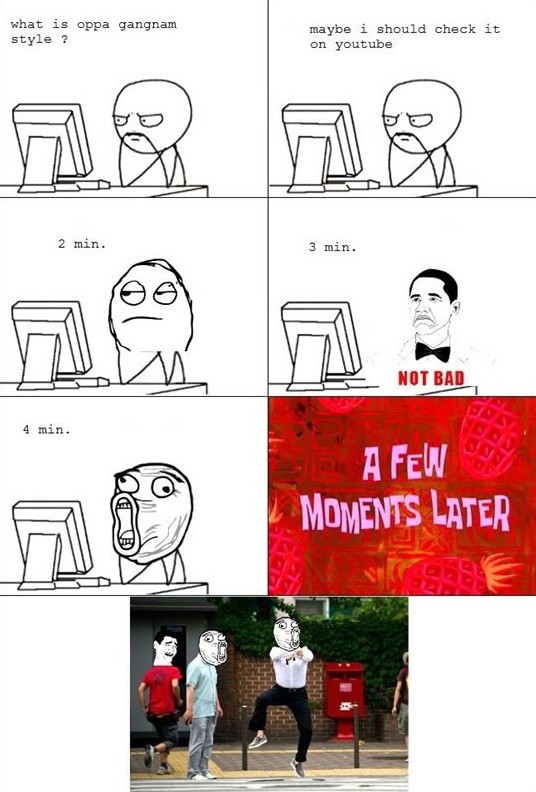 8일 온라인 커뮤니티에는 ‘강남스타일 중독 과정’이라는 카툰이 공개됐다. 처음에는 ‘강남스타일’이 뭔지 궁금해 하던 카툰 속 주인공이 2분, 4분 단위로 점차 달라지는 표정을 보인다. 궁금증에서 호기심으로, 이내 탄성으로 바뀐 카툰 주인공은 어느새 스스로 싸이가 돼 말춤을 추고 있는 것.