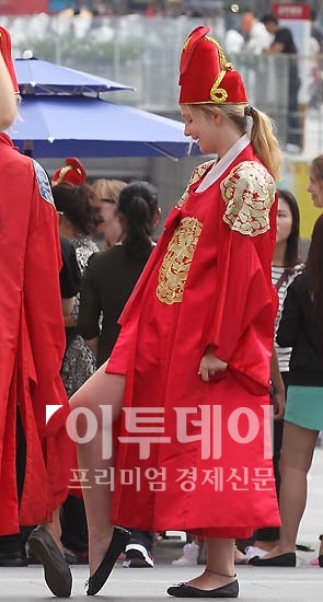 9일 서울 광화문광장에서 외국인 관광객들이 곤룡포를 입고 기념촬영을 하고 있다.