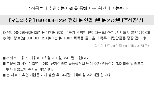 따라서 그 누구도 예측하기 어려운 대대적인 지각변동이 일어나 폭등주의 판도가 뒤바뀌기 시작하는데, 필자가 천신만고의 노력 끝에 추천하는 이 종목은 폭발적인 상한가 레이스에 심장이 약한 투자자는 상한가 3~4방 정도에 매도해 주면 좋고, 심장이 강한 분이라면 시세의 끝자락까지 들고가 大폭등을 만끽하시기 바란다.