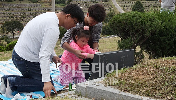 추석을 보름여 앞둔 16일 오후 경기도 파주시 광탄면 용미리 공원묘지에서 한 가족이 성묘를 하고 있다.