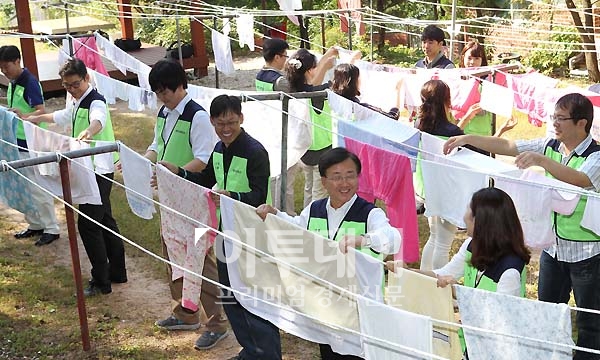 이동근 상근부회장(앞줄 오른쪽 두번째)을 비롯한 대한상공회의소 임직원들이 20일 서울 종로구 청운노인요양원을 방문해 빨래 봉사활동을 하고 있다.