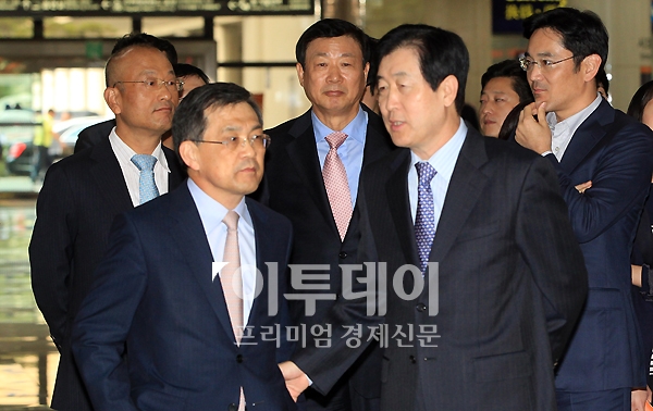 최지성 삼성 미래전략실장과 이재용 삼성전자 사장 등 경영진들이 20일 오후 김포공항에서 이건희 삼성전자 회장의 입국을 기다리고 있다.