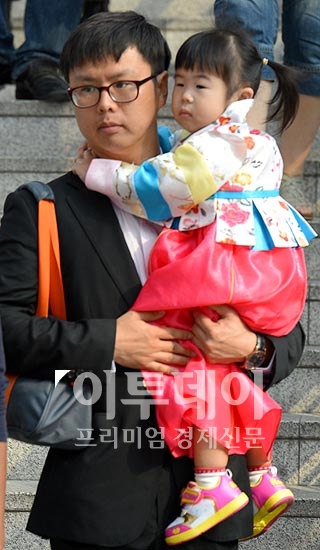 민족 고유의 명절 추석을 앞둔 28일 오전 서울역에서 한 어린이가 한복을 입고 부모와 함께 귀성길에 오르고 있다