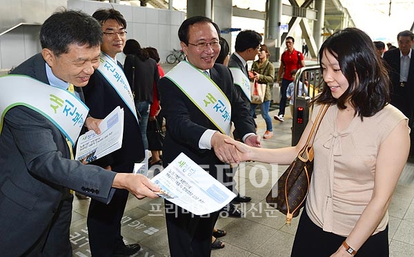 민족 고유의 명절 추석을 앞둔 28일 오전 새진보정당추진위원회 노회찬 공동대표가 서울역에서 귀성길에 오르는 시민들과 인사를 하고 있다.