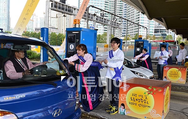 본격적인 추석 귀성행렬이 시작된 29일 오후 성남 궁내동 서울요금소에서 한복을 곱게 차려입은 한국도로공사 직원들이 귀성차량 운전자들에게 안전운전 안내책자와 최신 교통지도를 나눠주고 있다.