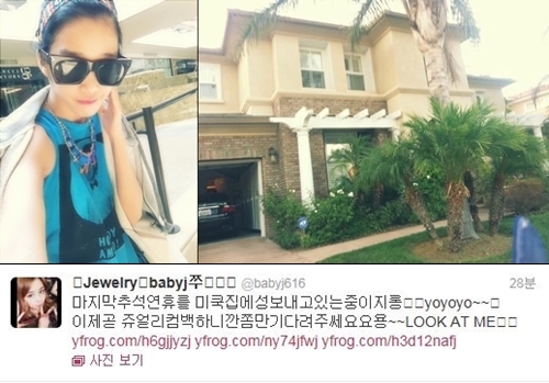 하주연은 1일 자신의 트위터에 "마지막 추석 연휴를 미국집에서 보내고 있는 중이지롱 yoyoyo~~ 이제 곧 쥬얼리 컴백하니까 쫌만 기다려주쎄요요용~ LOOK AT ME"라는 글과 사진 세 장을 게재했다.