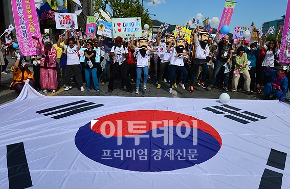단기 4345년 개철전인 3일 서울 광화문에서 국학원 주최로 열린 '코리아 힐링 페스티벌 거리 퍼레이드'에서 단군 가면을 쓴 참가자들이 가수 싸이의 '강남스타일' 말춤을 추고 있다. 이들은 세종로공원에서 서울시청 앞 덕수궁까지 퍼레이드를 펼쳤다.