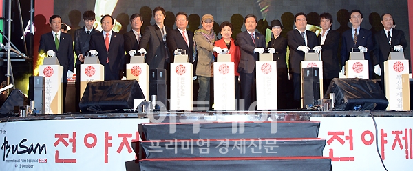 제17회 부산국제영화제 전야제 행사인 ‘We Opens BIFF’ 행사가 3일 오후 남포동 BIFF광장 특설무대에서 열린 가운데 행사에 참석한 관계자들과 영화배우들이 전야제 개최를 알리고 있다.