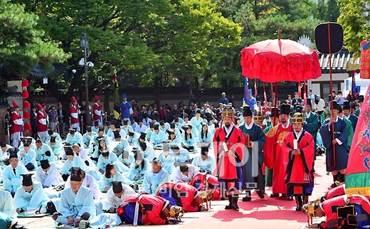 7일 서울 운현궁에서 '제19회 조선시대 과거제 재현행사'가 열린 가운데 어가행렬이 들어서고 있다.