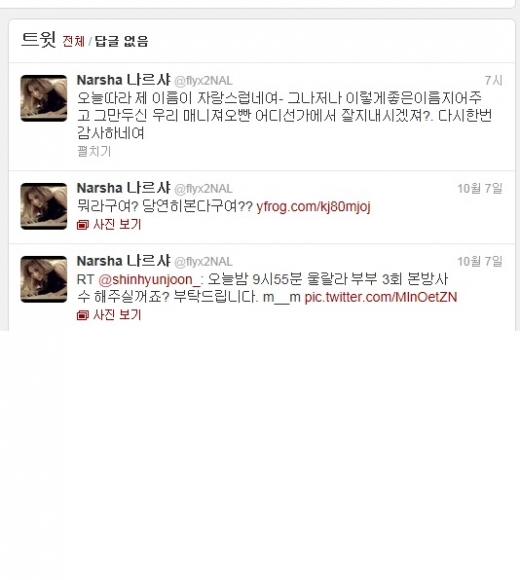 9일 자신의 트위터를 통해 나르샤는 “오늘따라 제 이름이 자랑스럽네요~ 그나저나 이렇게 좋은 이름 지어주고 그만두신 우리 매니저오빠는 어디선가 잘지내시겠죠? 다시 한번 감사하네요”라는 글을 남겼다.