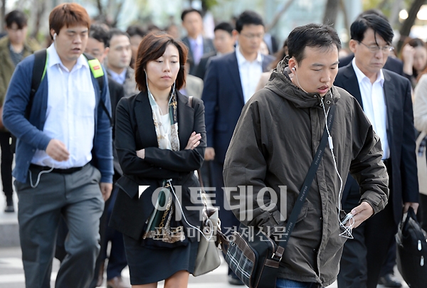 서울 아침 최저기온이 9.9도까지 떨어지는 등 올 가을 들어 가장 쌀쌀한 날씨를 보이고 있는 11일 오전 서울 여의도 인근에서 시민들이 몸을 잔뜩 움츠린채 출근길을 재촉하고 있다.