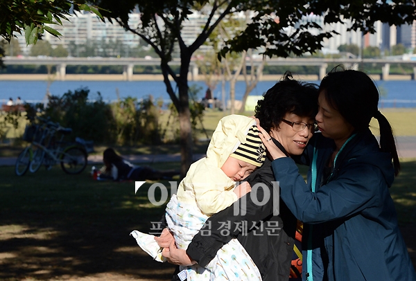 서울 아침 최저기온이 9.9도까지 떨어지는 등 올 가을 들어 가장 쌀쌀한 날씨를 보이고 있는 11일 오후 서울 여의도 한강시민공원에서 휴식을 즐기던 한 가족이 차갑게 불어오는 바람에 아기의 옷을 매만지고 있다.