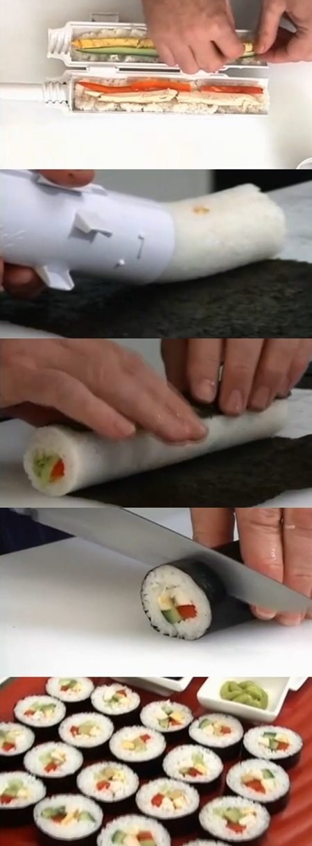 영상 속 원통형의 기구는 양쪽으로 열 수 있다. 이 안에 밥을 먼저 채우고 김밥에 들어가는 재료를 넣은 뒤 원통을 닫는다. 이후 동봉된 다른 작은 막대형 도구를 원통의 끝에 넣고 살살 밀어주면 원통형으로 단단하게 잘 말린 밥이 다른 쪽으로 나온다.