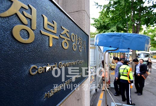 지난 14일 가짜신부증으로 별 제지없이 정부청사 사무실에 출입해 방화,투신 사건이 일어난 서울 세종로 정부중앙청사에서 15일 오전 경찰이 출근 공무원들의 신분증을 일일이 확인하며 출입 검색을 강화하고 있다.