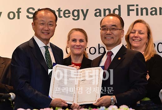 박재완 기획재정부 장관과 김용 세계은행 총재가 15일 서울 삼성동 인터컨티넨탈호텔에서 세계은행 한국사무소 설립 양해각서를 체결한 뒤 기념촬영을 하고 있다