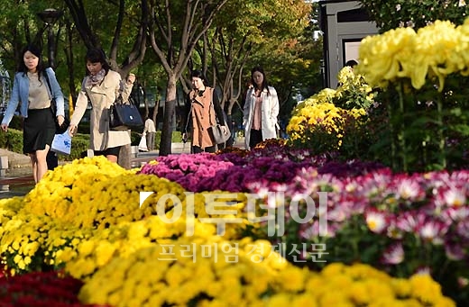 15일 서울 강남구 코엑스 인근에서 국화페스티벌이 열린 가운데 시민들이 만발한 국화꽃 사이로 출근길을 재촉하고 있다.