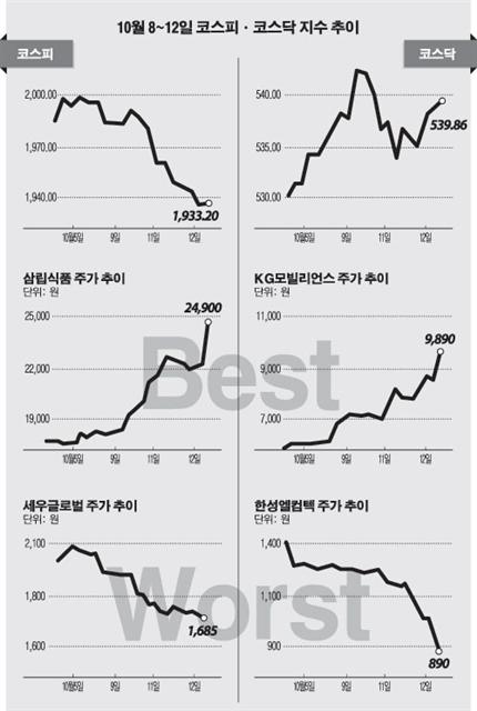 중소형주와 코스닥 종목이 부각되면서 코스닥시장은 지난주(8~12일) 비교적 큰 폭의 상승세를 기록했다. 글로벌 경기 둔화와 기업 실적 우려가 지속되면서 지수 관련 대형주의 지지부진한 흐름이 이어지고 있는 가운데 코스닥 시장이 대안으로 부상한 결과다. 지난주 코스닥 시장은 이틀째 오르면서 4.91포인트(0.92%) 539.86포인트로 마감했다. 지난주 코스닥시장에서는 다양한 테마주가 등락을 거듭한 가운데 전자결제 관련주, 바이오·제약주의 강세가 두드러졌다.