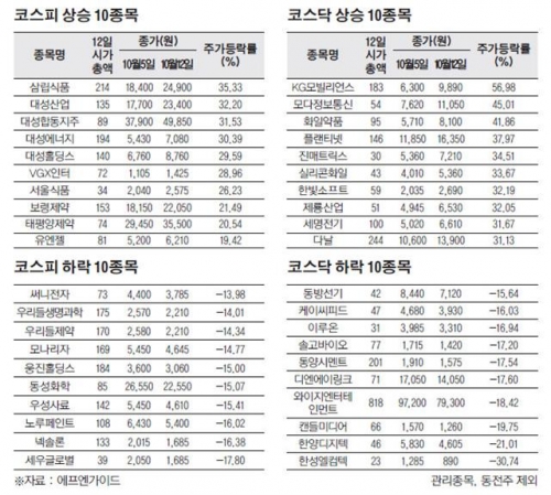 유상증자 후폭풍에 솔고바이오는 17.20% 떨어졌고, 올해 매출목표를 150억원에서 120억원으로 하향조정한다고 밝힌 디엔에이링크는 실망매물이 쏟아지며 17.60% 하락했다.