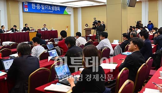 24일 서울 삼성동 코엑스에서 한중일 FTA 공청회가 열린 가운데 김원호 한국외대 국제대학원 교수가 주제발표를 진행하고 있다.