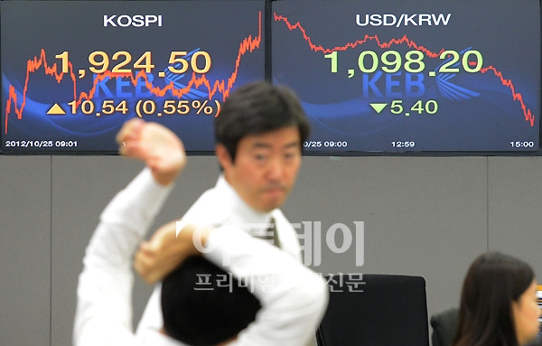 원달러 환율이 1100원 아래로 떨어졌다. 25일 오후 달러당 원화는 5.40원 내린 1098.20에 장을 마쳤다. 원달러 환율이 1100원 아래로 떨어진 것은 13개월여 만이다. 사진은 이날 오후 중구 외환은행 본점 딜링룸.