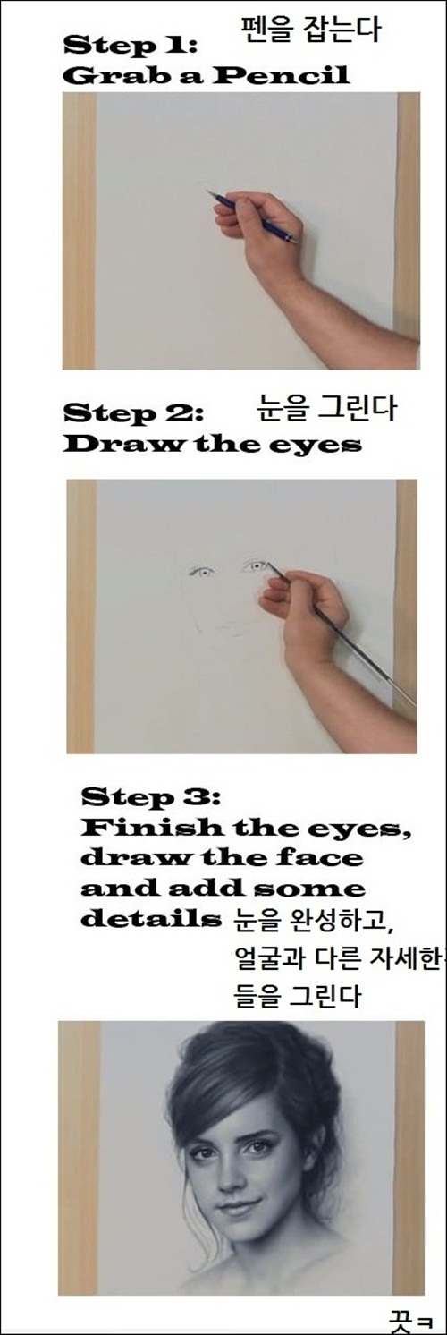 영화 해리포터에서 헤르미온느로 열연한 엠마왓슨을 간단하게 그리는 3가지 단계가 공개된 것. 게시물에 따르면 '1. 펜을 잡는다, 2. 눈을 그린다, 3. 눈을 완성하고 얼굴과 다른 자세한 것들을 그린다'라고 적혀 호기심을 자아낸다.