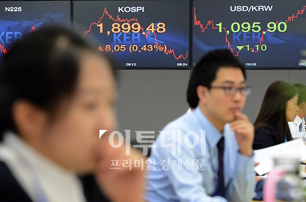 1900선 회복을 앞둔 코스피가 29일 오전 등락을 거듭하며 장을 이어가고 있다. 원달러 환율은 1.10원 하락한 1095.90을 나타내고 있다. 사진은 이날 오전 중구 외환은행 본점 딜링룸.