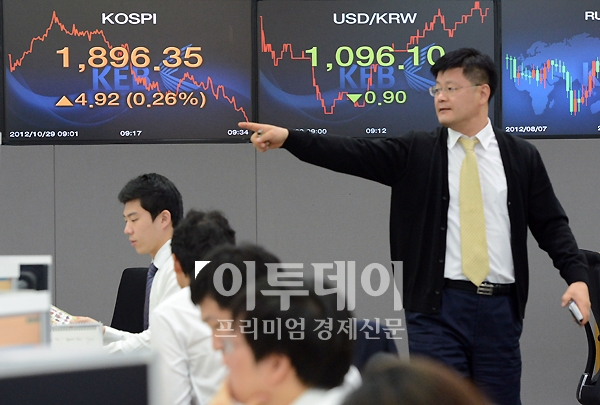 1900선 회복을 앞둔 코스피가 29일 오전 장중 등락을 거듭하며 장을 이어가고 있다. 원달러 환율은 0.90원 하락한 1096.10을 나타내고 있다. 사진은 이날 오전 중구 외환은행 본점 딜링룸.