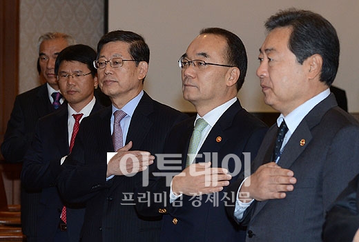 김황식 국무총리(왼쪽 세번째)를 비롯한 국무위원들이 30일 오전 서울 세종로 정부중앙청사에서 열린 국무회의에서 국민의례를 하고 있다.