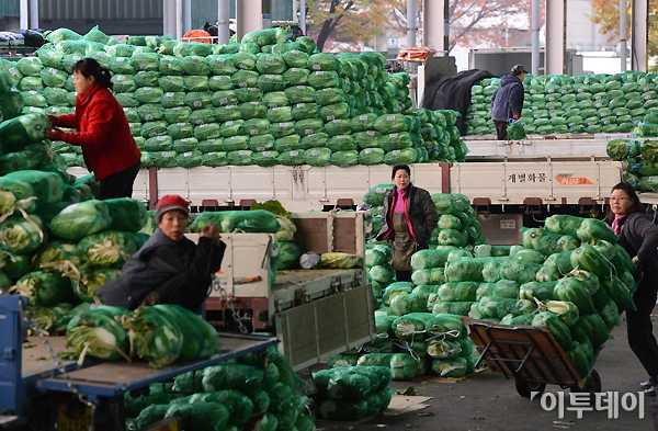 올해 태풍과 집중 호우의 영향으로 배추와 무 생산량이 줄어 김장을 앞두고 가격이 오를 것으로 예측됐다. 31일 오전 서울 가락동 농수산물도매시장에서 상인들이 분주히 움직이고 있다.