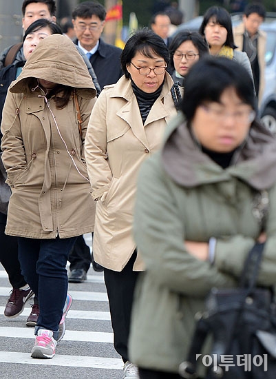 초 겨울 날씨를 보인 31일 오전 서울 광화문네거리에서 시민들이 몸을 움츠린채 출근길을 서두르고 있다.