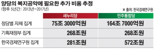 양당이 쏟아낸 복지정책을 이행하기 위해서는 향후 5년간 최소 268조원(연간 53조원)의 추가 재원이 필요하다는 게 기획재정부의 분석이다. 한국경제연구원은 새누리당 정책은 연간 56조원, 민주당의 경우 114조원이 더 소요될 것으로 추정했다.
