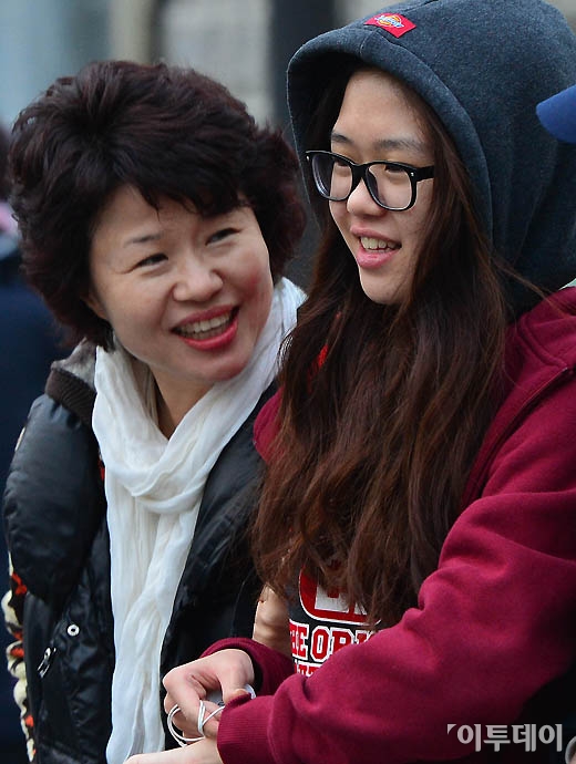 2013학년도 수학능력시험이 치러진 8일 서울 종로구 풍문여고에서 시험을 마친 수험생들이 어머니와 대화를 나누고 있다.