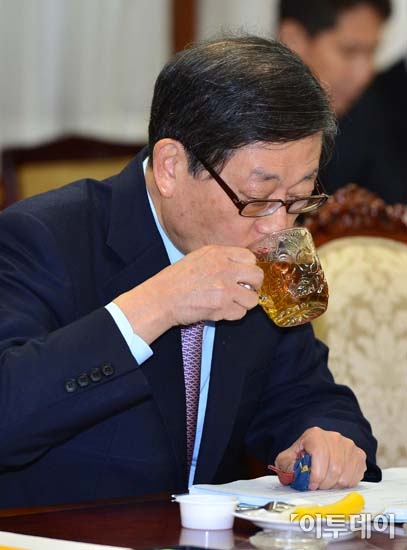 김황식 국무총리가 9일 오전 서울 세종로 중앙정부청사에서 열린 국가정책조정회의에서 물을 마시고 있다.