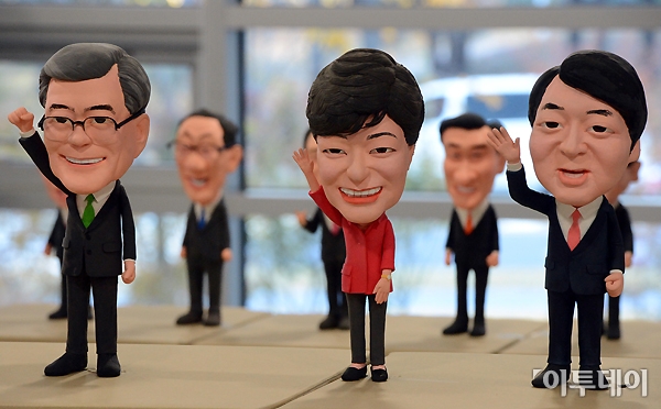 대선 후보들의 캐리돌(캐리커쳐와 인형의 합성어) 전시회가 13일 오전 서울 여의도 국회 의원회관에서 열리고 있다. 사진 왼쪽부터 문재인 후보, 박근혜 후보, 안철수 후보의 캐리돌.