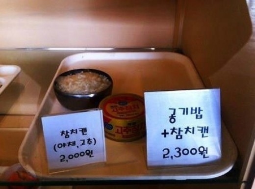 사진 속 학생 식당 메뉴는 영양을 전혀 고려하지 않은 간편 식단으로 보는 이들을 놀라게 한다. 메뉴가 '공기밥+참치캔'으로 2300원에 판매되고 있는 것. 그 옆으로는 참치캔(야채, 고추)이 2000원에 소개돼 있다.