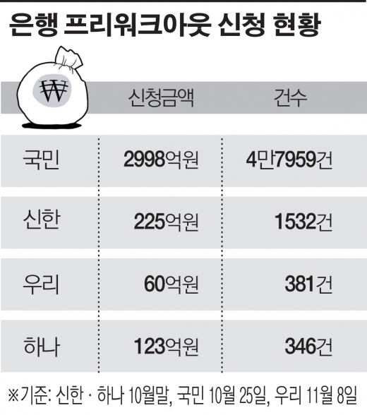 이미 지난 2008년 부터 프리워크아웃을 시행하고 있는 국민은행은 지난달 25일 기준 2998억원(4만7959건)을 기록, 지난해 말 2650억원(4만1156건)보다 13%.1 증가한 실적을 보였다.