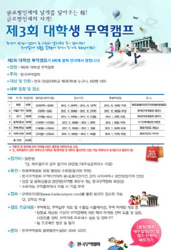 전국 6개 도시에서 실시될 대학생 무역캠프는 제주 지역에서 오는 12월 20일부터 내년 1월 23일까지 용인, 대전, 화순, 부산 등 전국에서 순차적으로 개최된다.