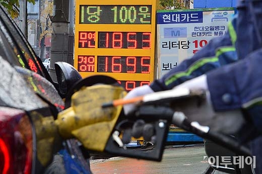 주유소에서 판매되는 휘발유 가격이 9주 연속 내림세를 이어 가고 있는 가운데 19일 오전 서울 시내의 한 주유소가 ℓ당 1천853원에 판매하고 있다. 한국석유공사에 따르면 이번 주 주유소 판매 기준 휘발유 가격은 지난주보다 12.9원 내린 ℓ당 1천957.3원을 기록했다. 경유는 ℓ당 1천779.2원으로 10.2원 하락했고, 등유도 5.7원 내린 1천394.5원을 기록하며 10주 만에 1천400원선 아래로 떨어졌다.