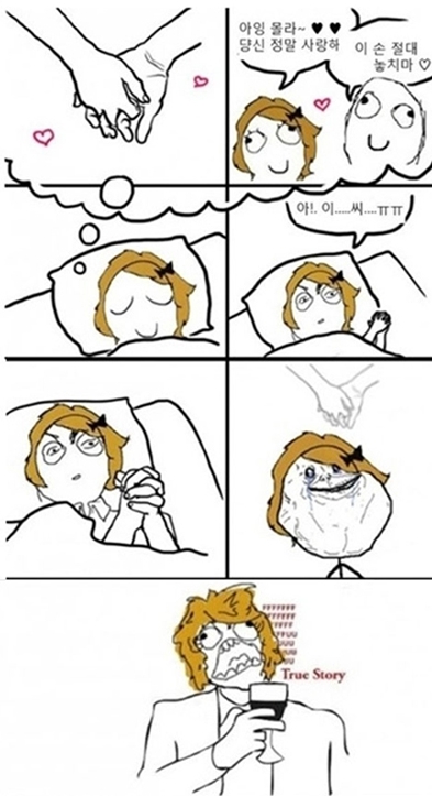 만화에 등장하는 여자는 한 남자와 손을 맞잡고 사랑을 약속하지만 잠에서 깨면서 모두 꿈이었음을 알게 된다. 어젯밤 설렜던 손은 바로 자신의 두 손임을 깨닫고 '멘탈 붕괴'에 빠진다.