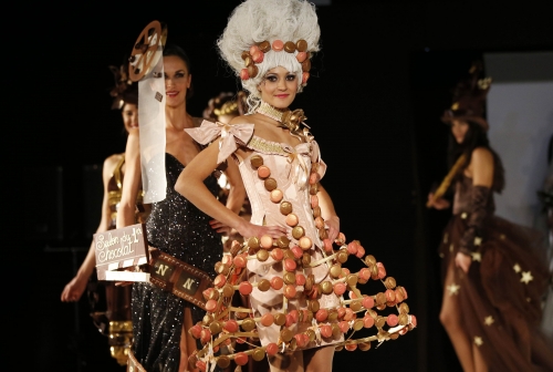 프랑스 칸에서 22일(현지시간) 열린 ‘칸 국제 초콜릿 박람회’ 행사에서 초콜릿과 마카롱으로 만든 드레스를 입은 모델이 포즈를 취하고 있다. 박람회는 오는 25일까지 열린다. 칸/AP연합뉴스