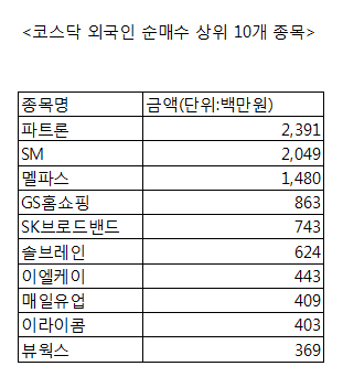 [코스닥 외국인 순매수 상위 10개 종목]