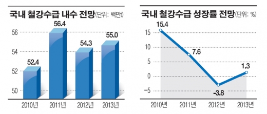 포스코경영연구소는 26일 “2012년 철강 내수 시장이 연간 -3.8% 성장할 것”이라고 내다봤다. 철강 내수 시장의 마이너스 성장은 금융위기 당시인 2009년 -22.0% 이후 처음이다.