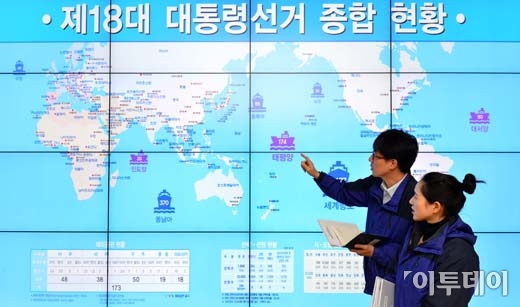 제18대 대통령 선거 공식 선거운동 시작을 하루 앞둔 26일 오전 경기도 과천시 중앙선거관리위원회 종합상황실에서 선관위 직원들이 업무에 열중하고 있다.